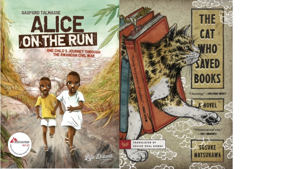 The committee also chose two honor books, Alice on the Run: One Child’s Journey Through the Rwandan Civil War, by Gaspard Talmasse, translated from French by Nanette McGuinness and published by Life Drawn, by Humanoid, and The Cat Who Saved Books: A Novel, by Sosuke Natsukawa, translated from Japanese by Louise Heal Kawai and published by HarperVia.